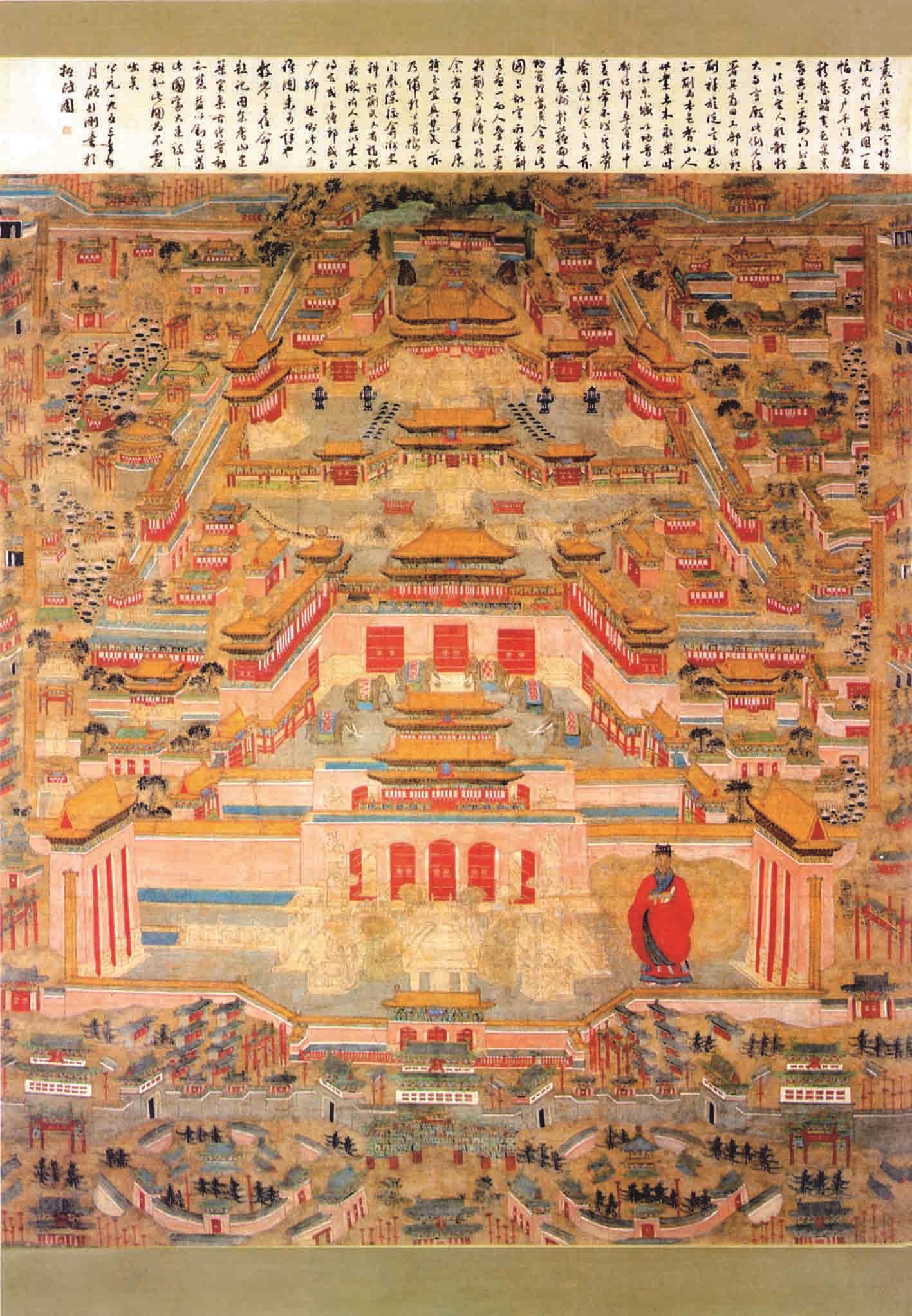 第一幅画面上表现了紫禁城全貌。画轴纵169厘米,横156厘米,在画面承天门的东侧,是一位身穿盘领宽袖红袍的官员:头戴纱帽,前胸有补子,腰上有玉带,手中没有上朝用的笏板。在这幅图下端,有民国阚铎的跋文。