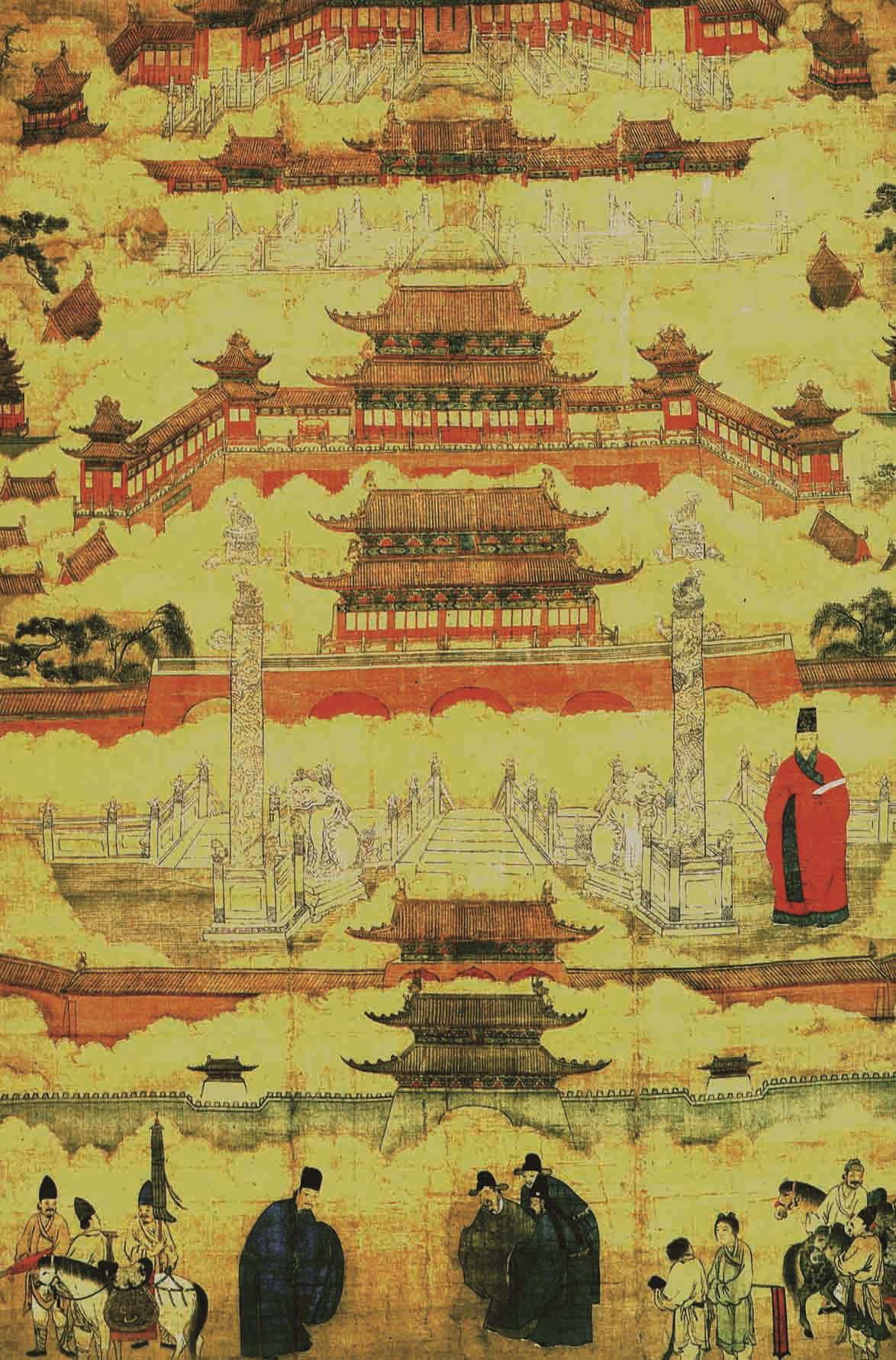 筚路蓝缕,皓首穷经,长年的深研,总是一种情愫的牵擎,时代给智者以才能的发挥,时代造就了可名垂千史的伟大人物。正是因为这张宫城图、图中的红袍官人,总是被人瞩目,所以对其探究也就一直没断过。正是这种执着,便有了另外的认知,或者是研究成果,由此便有了历史的追问: