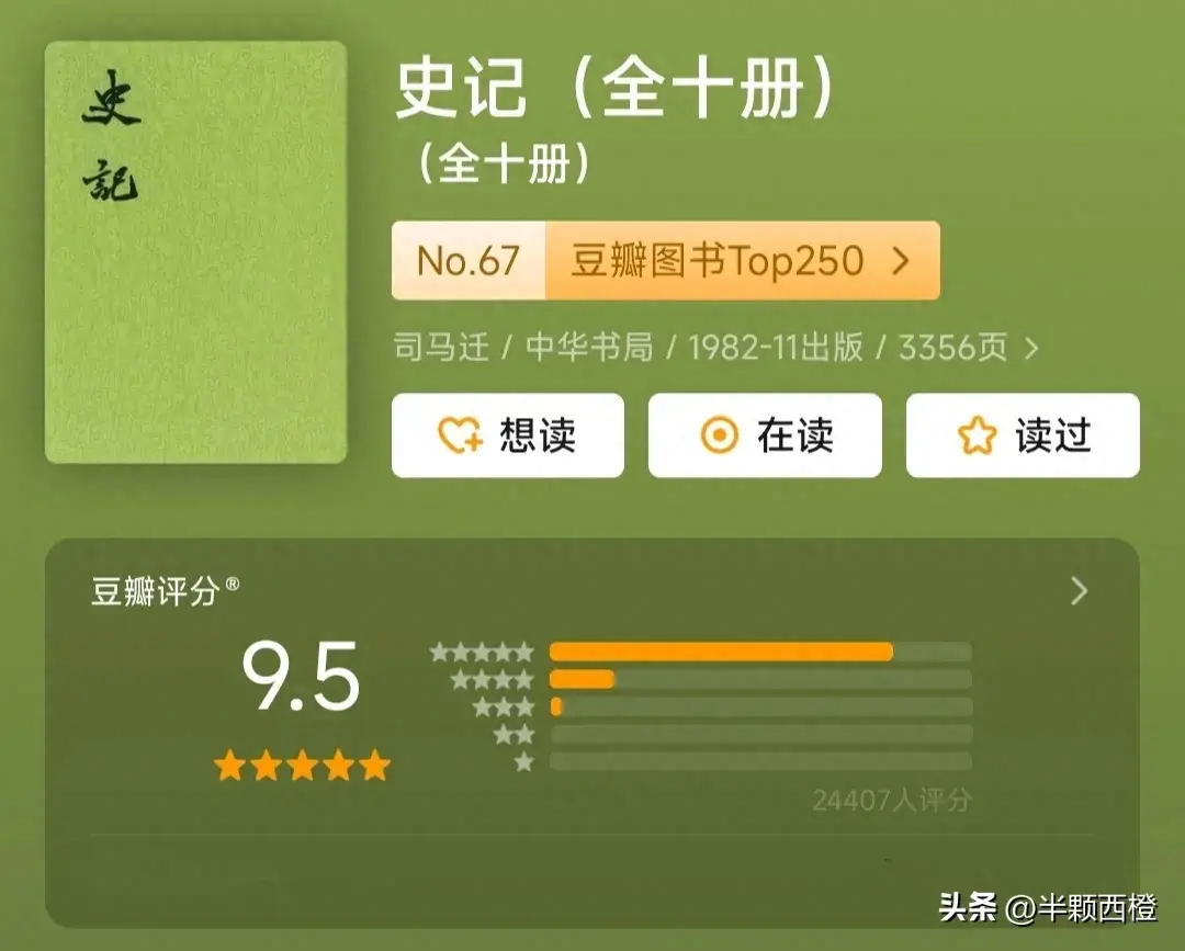 作为我国的第一部纪传体通史,《史记》的地位绝不容忽视。在史记之前,有以年代为次的“编年史”如春秋,有以地域为限的“国别史”如国语、战国策,有以文稿档卷形式保存下来的“政治史”如尚书,可是没有一本书能够包容上下几千年,包罗各方面,又融会贯通的。喜欢读历史的人几乎不容错过哦。