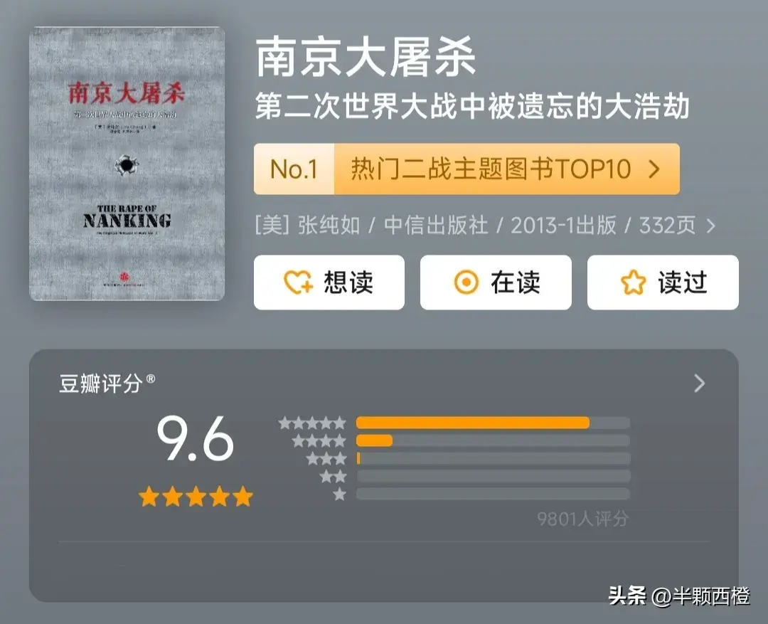 一部令国人流泪的书,所有的中国人都要看的书!作者张纯如,美国华裔作家,多次前往南京,考究过大量的历史资料,只为将此书著成。没想到,在这本书出版后,有人竟以她儿子的性命为要挟。为了孩子,她选择自尽。