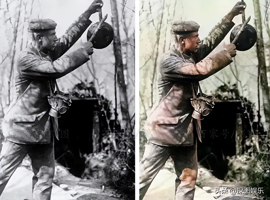 11.一战时带着防毒面具的士兵,左手拿炒锅,右手拿铁棍,饿的人看了是叫士兵去吃饭;不饿的人看了是敌军接近,注意隐蔽准备火拼。