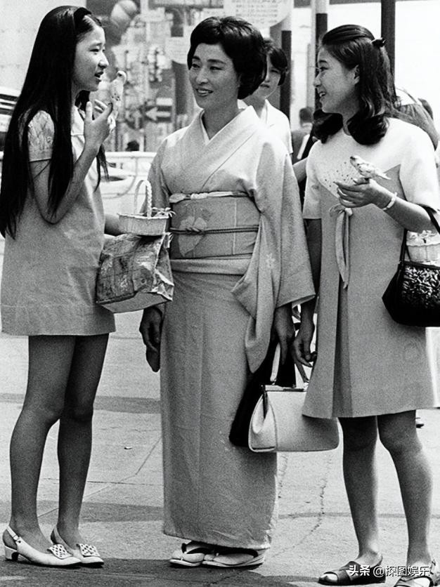 2.1968年的日本街头,两位身著短裙的和一位穿着和服的女子。