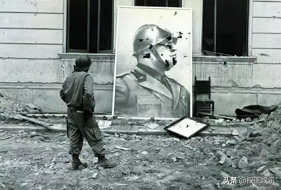 4.1944年意大利罗马,盟军士兵站在一块废弃的墨索里尼肖像前思考人生。