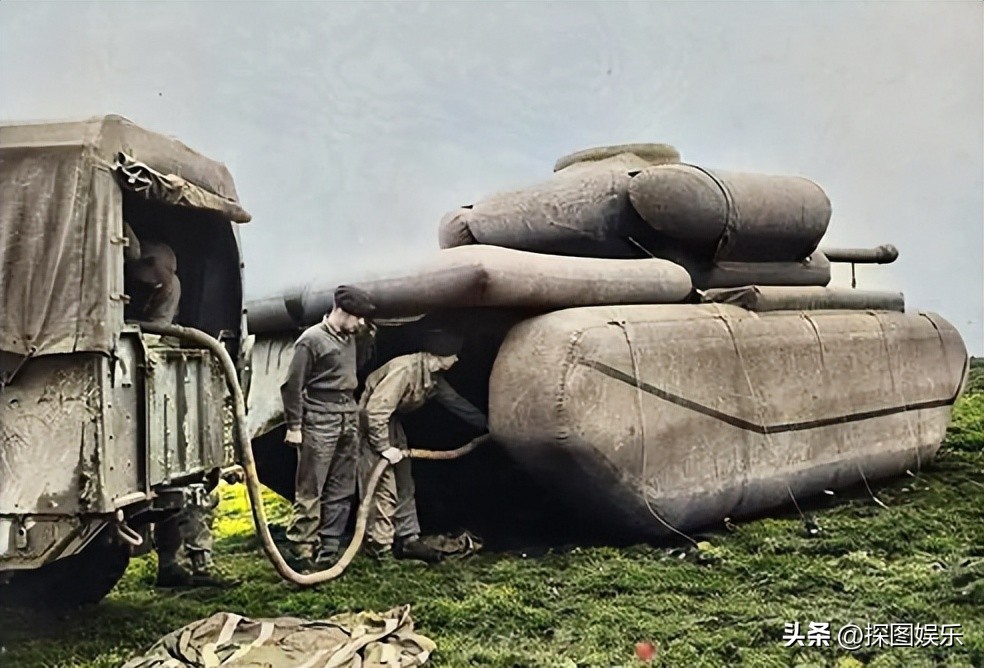 5.英国士兵正在给假坦克充气。