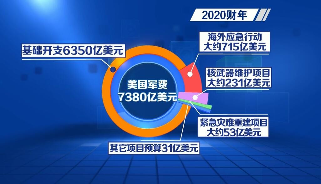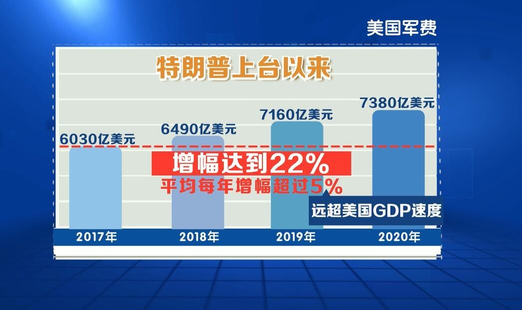 但是从2017年,特朗普上台以来,这一数字逐渐走高。2017年当年,美国军费是6030亿美元,2018年达到6490亿美元,2019年达到7160亿美元,首次超过2011年的7111亿美元,创下历史新高,2020财年的7380亿美元继续创下新高。换个角度看,特朗普上台以来,只花了4年时间,美国军费就从2017年的6030亿美元,迅速增长到2020财年的7380亿美元,增幅达到22%,平均每年增幅超过5%,增长速度远超美国GDP的速度。有专家预测,如果按照这个速度增加,美国军费将在7年内超过1万亿美元。目前,全世界GDP总量超过1万亿美元的经济体只有16个,也就是说,全世界有170多个国家和地区,每年的GDP总量都不如美国军费的开支。