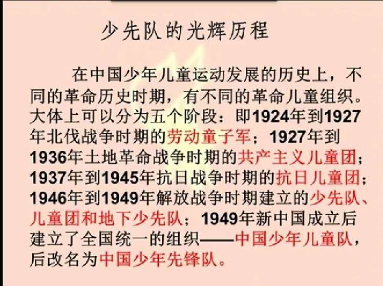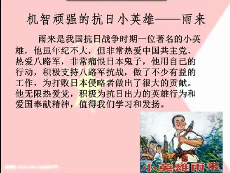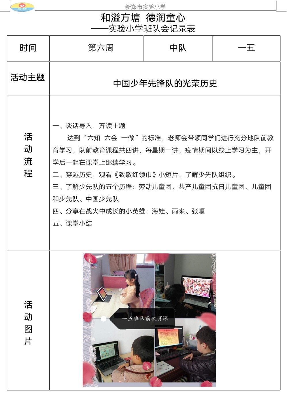 队前教育课程共四讲,疫情期间是以线上学习为主,开学后会在课堂上一起继续学习。此次教育课共分为三个环节:第一环节:穿越历史,观看《致敬红领巾》的小短片,去了解少先队组织。中国少年先锋队第一个先期组织在安源诞生;第二环节:了解少先队的五个光辉历程:劳动童子团、共产儿童团、抗日儿童团、儿童团和少先队、中国少先队;第三环节:学习在战火中成长的小英雄:送鸡毛信的抗日小英雄——海娃;银幕上的抗日小英雄——张嘎;机智顽强的抗日小英雄——雨来。他们都是小英雄,用自己的行动和生命为祖国和人民做出了贡献,应当向他们学习和致敬。最后,李老师告知孩子们,今年的入队仪式和往年不一样,老师会根据孩子们在线学习的状态、作业完成的质量等评选出一部分优秀的孩子六一前夕先入队。
