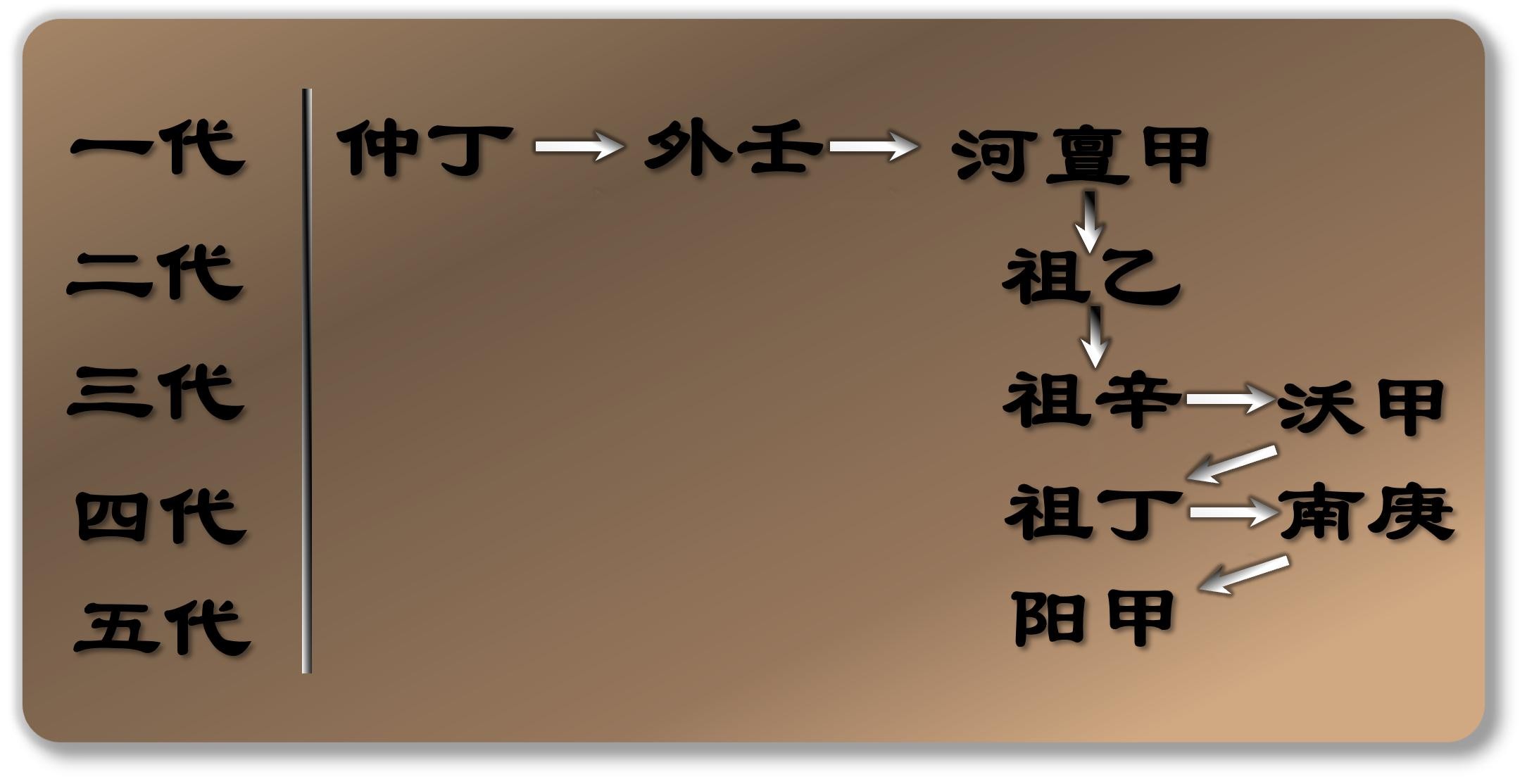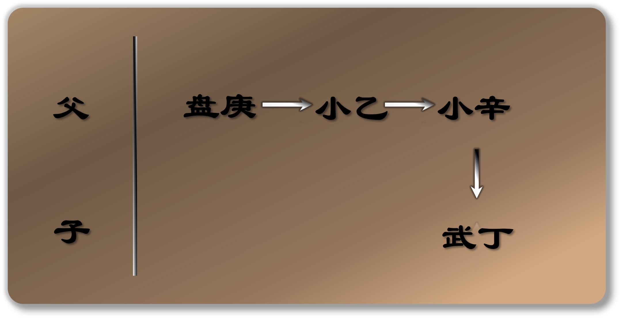盘庚去世后,王位依次传给了他的两个弟弟小辛和小乙,遵循"兄——弟"模式。关键的改变发生在小乙之后:小乙去世后,继位的是他的儿子武丁,而非盘庚的后代。