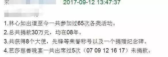 据统计,08年汶川地震林心如捐了10万,08年总共捐款30万,与此同时共获得8个大使/先锋等荣誉称号。