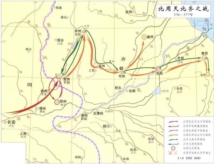 北齐的朝政虽然被败家子高湛搞得污七八糟,可是“瘦死的骆驼比马大”, 高欢留下的底子确实很厚。北周在军事上由宇文泰时代的战略防御,逐渐转为战略进攻,但要想吃掉北齐,还真不是那么容易。北齐不仅在经济文化上强过北周,更有一批英勇善战的鲜卑宿将,武威不减当年的六镇军士。其中最强悍者,是称作北齐三杰的段韶、斛律光和高长恭。
