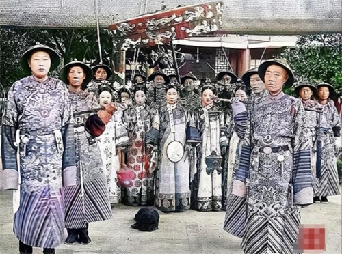 走在最后面的,是皇室成员和清廷文武大臣们,他们身穿黑色的丧服,摘掉了顶戴花翎,脸上表情悲伤,默默地跟随着灵柩前行。