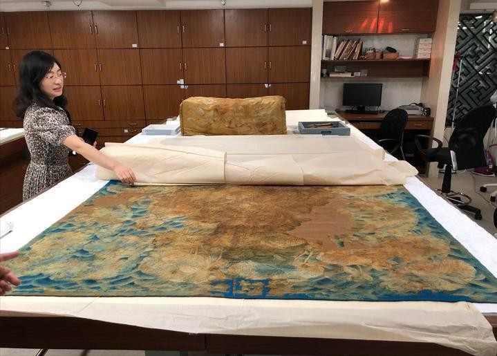 锦褥之上,又铺着一层绣满荷花的丝褥,丝褥上同样铺满了珍珠,数量多达2400粒,这些珍珠颗颗圆润饱满,在灯光的照耀下,散发出柔和而迷人的光泽。