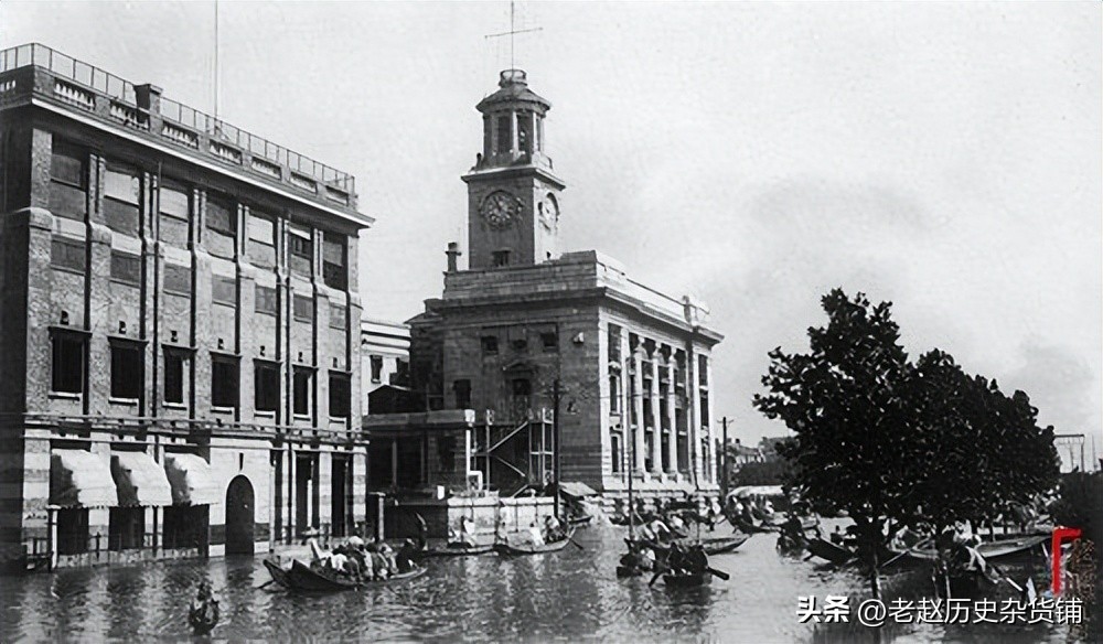 水灾后的汉口江汉关大楼。江汉关大楼建成于1924年1月,是中国现存最早的三座海关大楼之一。英国古典主义建筑风格,庄重典雅。坐南朝北,毗邻长江,总高度45.85米,是当时武汉最高的建筑。“江汉关钟楼呈对称布局,两侧与正立面墙体间呈92°夹角,与背面墙体呈90°夹角。大楼设计考虑了长江水位对建筑的影响,其基础高于长江平均洪水位标高。”这段记载,似乎可以解释为什么遭逢1931年水灾之后,江汉关还能挺立依旧。人们穿行于挺立依旧的江汉关前,似乎找到了某种安慰。