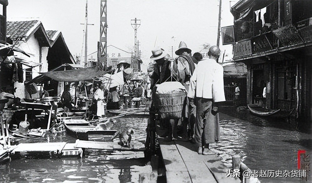 从照片上看,水位仅仅没过人的膝盖。屋檐下的人们好像在排队等小船出行,有的人短打扮,有的人着礼帽长裤长褂,还有一位着军装者……人们挨挨挤挤,又保持着距离,惊弓之鸟一般,难以打破的沉默弥漫于相片内外。