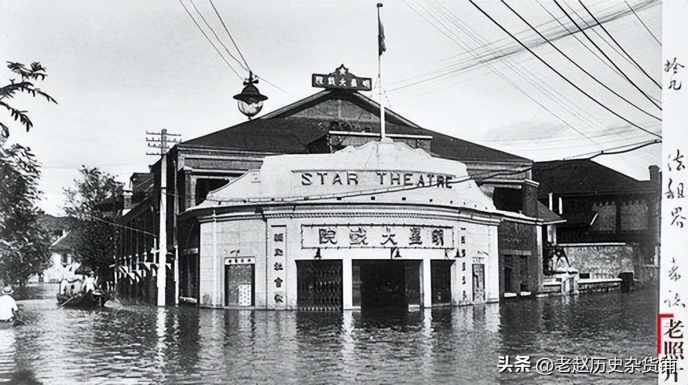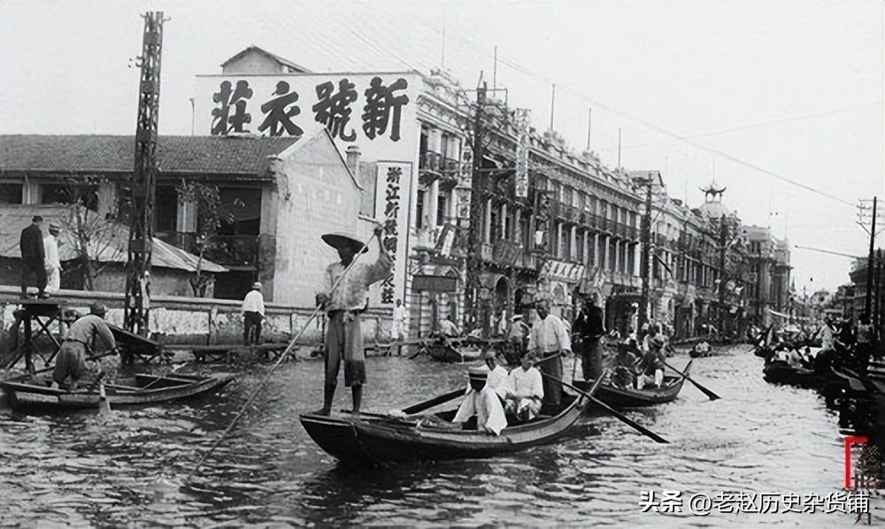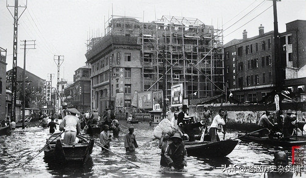 “太平洋饭店”“浙江实业银行”“上海服装店”等招牌远远可见,这座爬满脚手架的高楼竟然经受住了暴雨的袭击。 撑船的人、步行的人、坐船的人……闯进镜头的这位行人,脸色黧黑,似笑非笑似哭非哭……