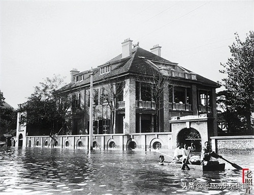 阳光正足,这座欧式洋楼里,二楼的主人正悠闲地斜倚栏杆——应该说如此大灾对于居住在楼里的富人,并无太大影响,就是出行麻烦了些。眼前的这只小木船,除了划桨的人,后边还有推船的人,他们如此艰难地在水上划行,这位妇人正木然地望着远处……