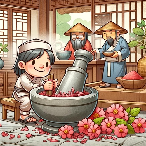 红蓝花首先被仔细捣碎,以便更好地提取色素。