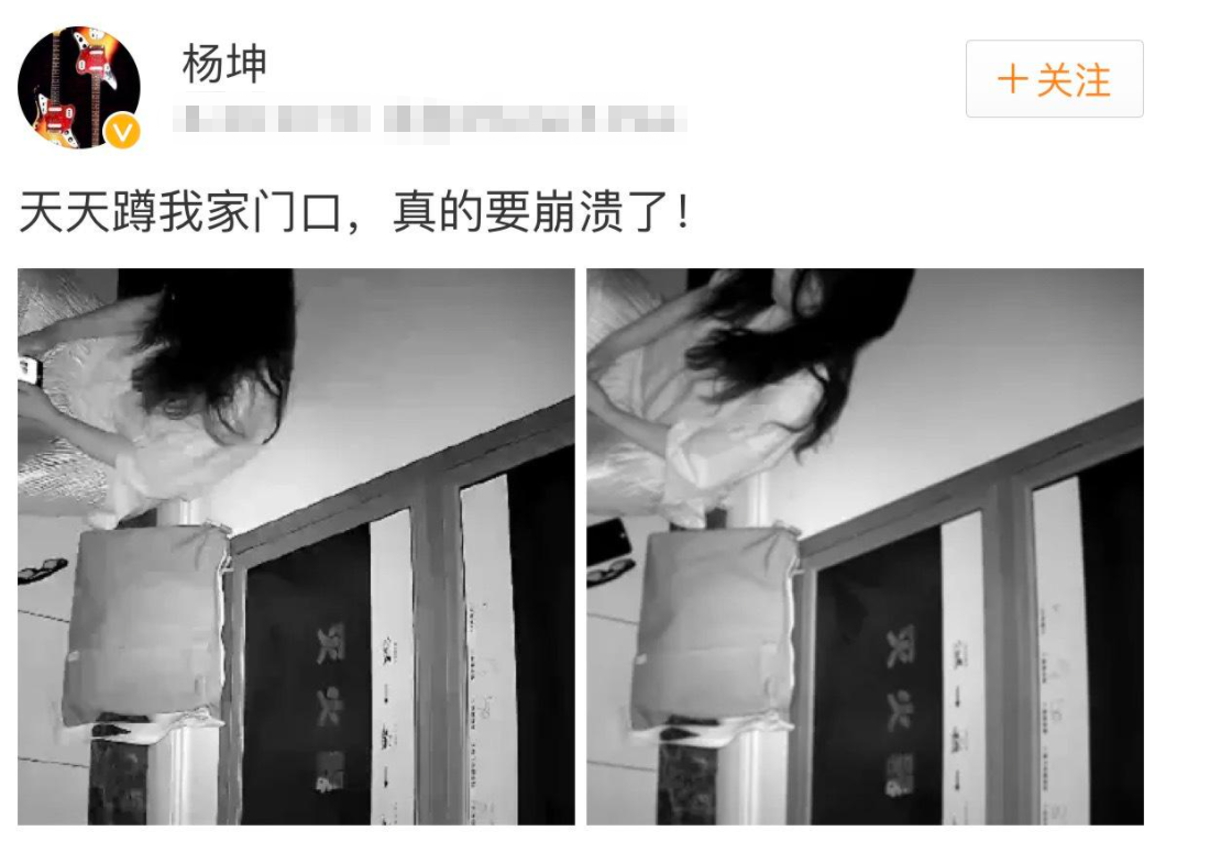 歌手杨坤前几年也曾在微博上控诉说有个女粉丝连续3个月都蹲在自己家门口,有时候还会敲门,往门缝里塞自己的照片,大喊“杨坤我爱你”。