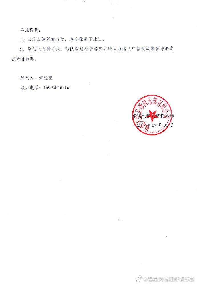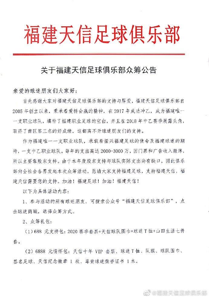 直播吧8月5日讯 中乙球队福建天信今天在官方微博发布众筹公告,俱乐部表示目前球队投入球队实际支出尚有缺口,因此俱乐部向全社会各界发起本次众筹活动,本次众筹所有收益,将全部用于球队。