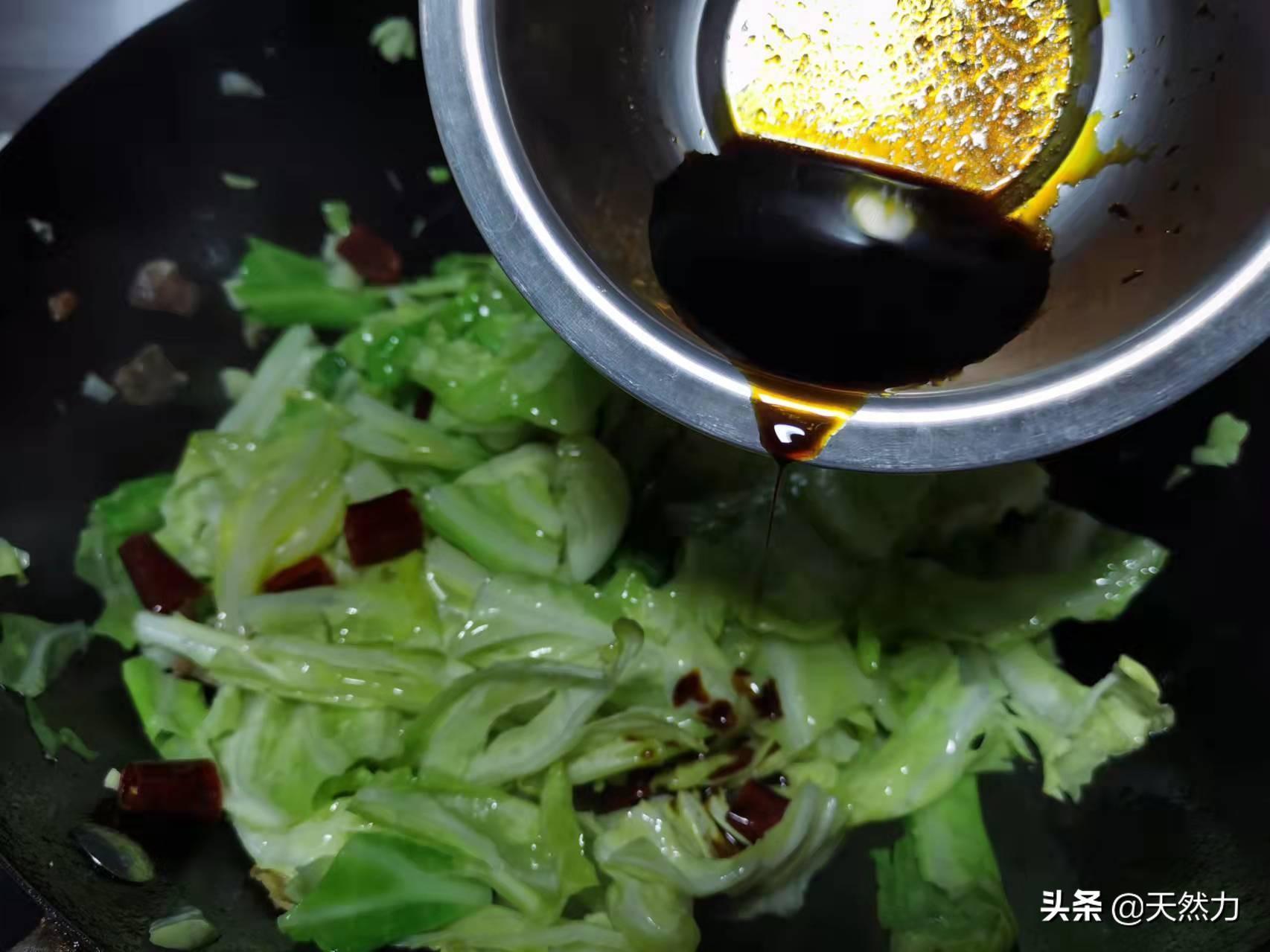 11、加入几滴老抽,为什么要加老抽呢?这是因为老抽是带甜味的,在大火翻炒的时候能增加一种带着酱香的焦香味,还有老抽也可以起到提色的作用。