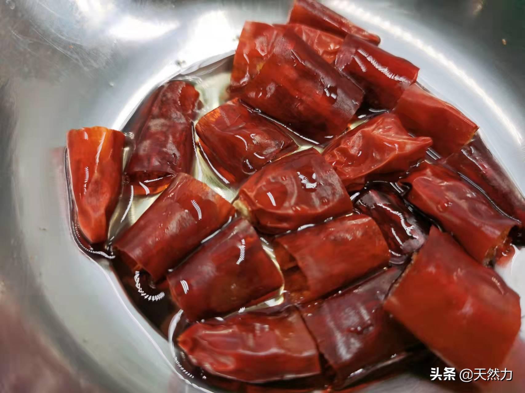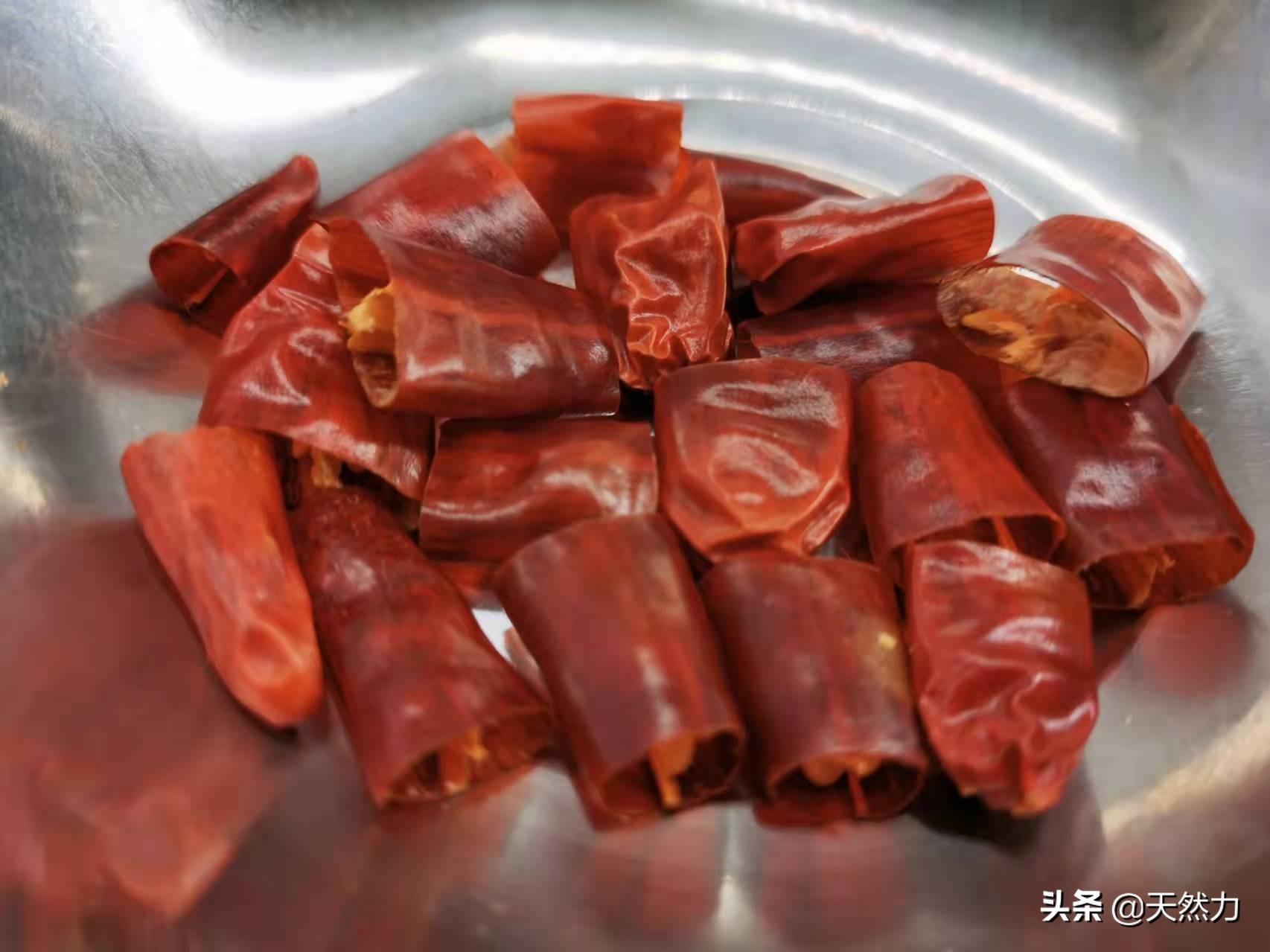 8、干辣椒切小段后把辣椒籽去掉,因为辣椒籽在煸炒的时候很容易炒糊发黑,这样就会影响成菜后的品质。