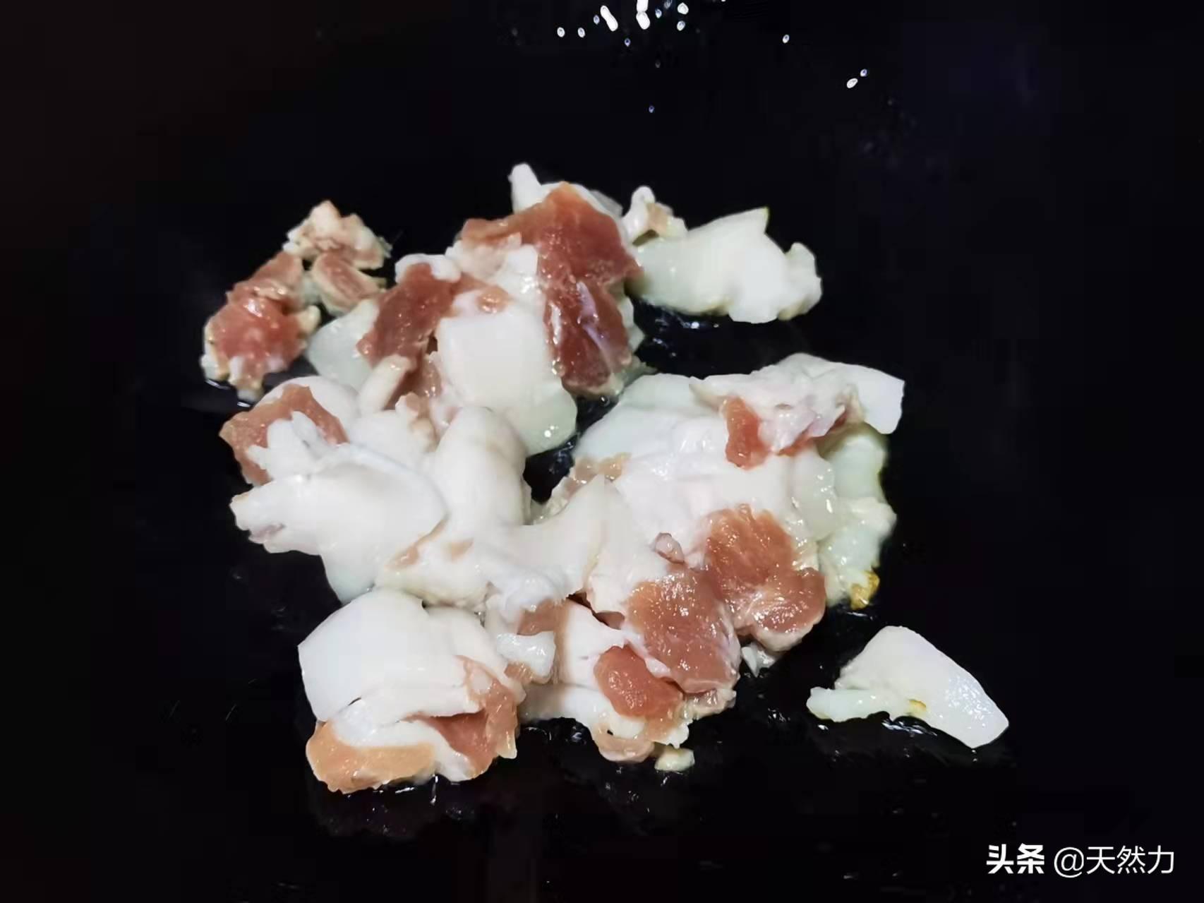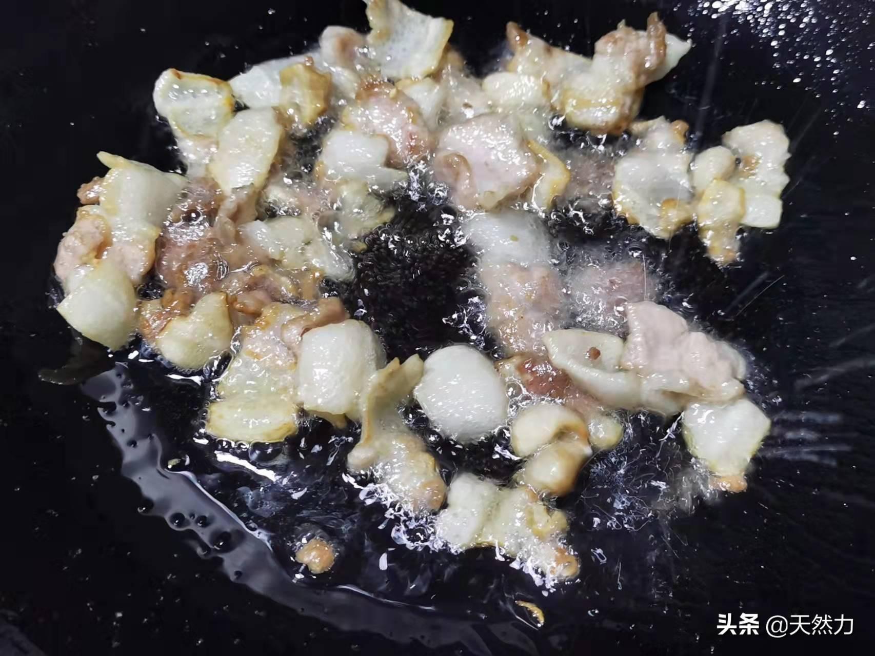 1、把锅烧至微微冒烟,加少许的油润锅,这就是我们要的热锅冷水的效果,接着下入五花肉,用中火把五花肉的油煸出来,这样可以得到我们要用的猪油,五花肉吃起来也不会油腻。