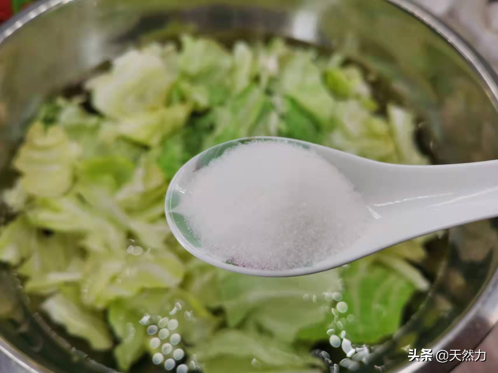 3、包菜叶撕好后放入大盘中,多加些水,再加一勺盐,用手搅拌均匀后浸泡15分钟以上。包菜在整个生长的过程中会招惹一些小虫子,所以菜农就难免会给包菜施打农药来驱虫,而农药的渗透力很强,会渗透到包菜内部去,但是包菜的结构十分紧密,渗透进去的农药就会残留在叶子上,我们用食用盐浸泡就可以起到消毒杀菌,分解农药残留的作用,使包菜能清洗得更加干净。