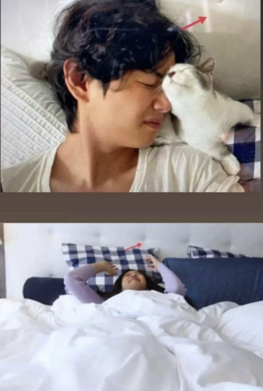 韩网Pann论坛近日出现一篇文章,内文指称两人可能早就交往超过1年,Jennie于2月曾经换床头板,当时还贴出与宠物在床上的合照,床板变成菱形状的条纹,然而,V最近被流出躺在Jennie床上休息的照片,却是Jennie还没换过的旧床板,以时间来推算的话,两人早在2月以前就已经是熟到可以出入彼此家中的关系。