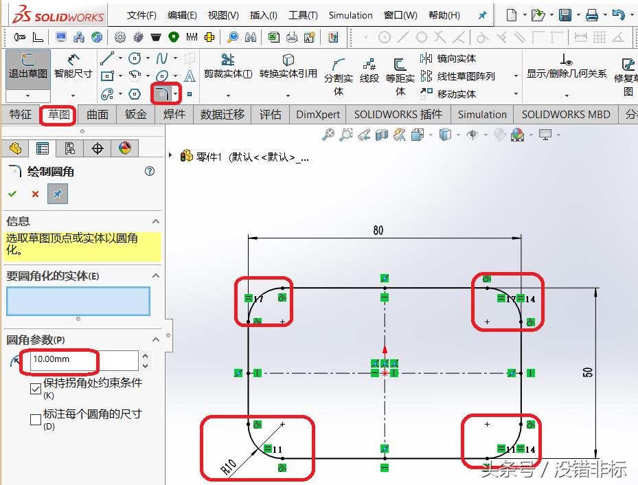 4、单击”草图“工具”栏中的“绘制圆角”命令按钮,绘制如图所示的四个圆角。