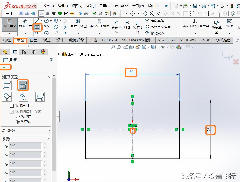 3、单击”草图“工具栏中的”中心矩形命令,选择坐标原点,绘制如图所示的矩形。