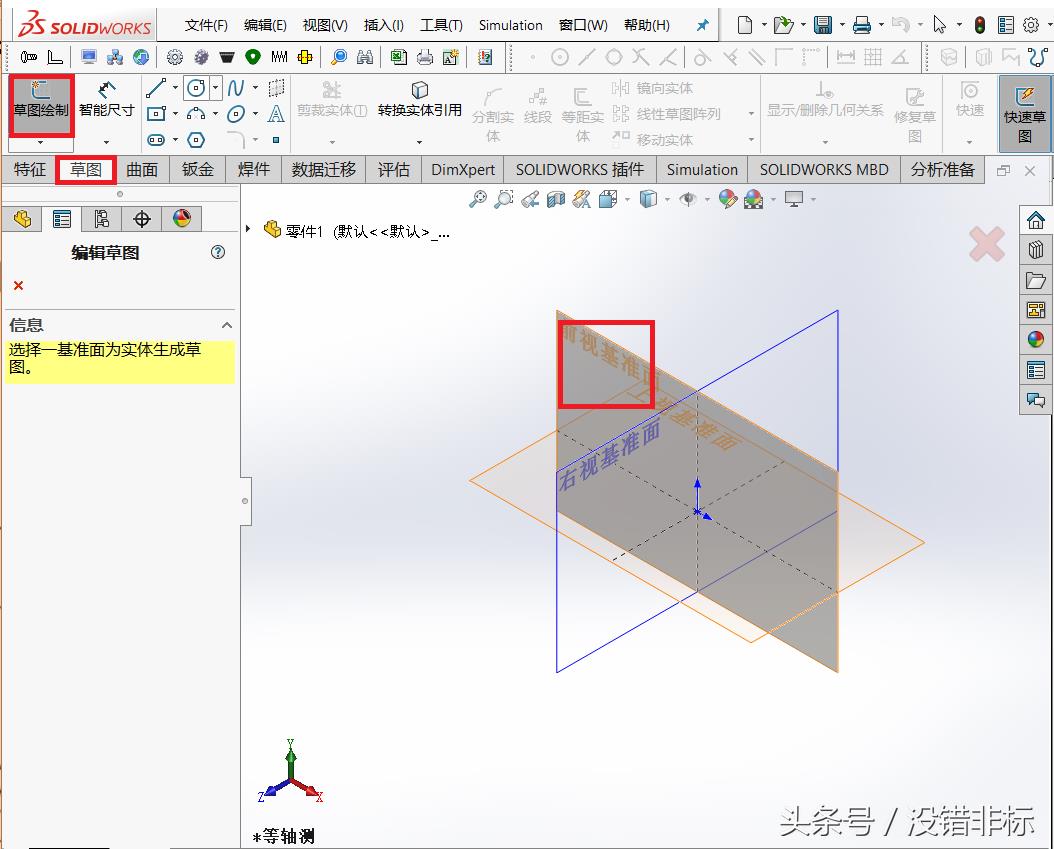 2、单击”草图“工具栏中的”草图绘制“命令按钮,选择前视基准面为草图绘制平面,如图所示。