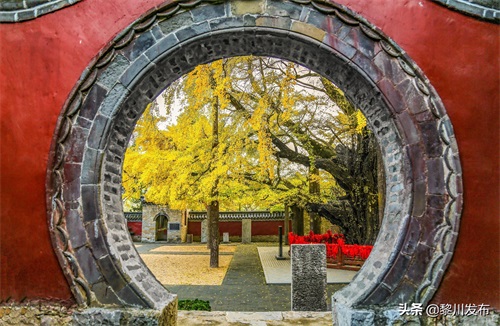 在浮来山定林寺前院中央,屹立着一棵参天古木,这便是“天下银杏第一树”,也有人管它叫“银杏之祖”。古树参天而立,远看形如山丘,龙盘虎踞,气势磅礴,冠似华盖,繁荫数亩。
