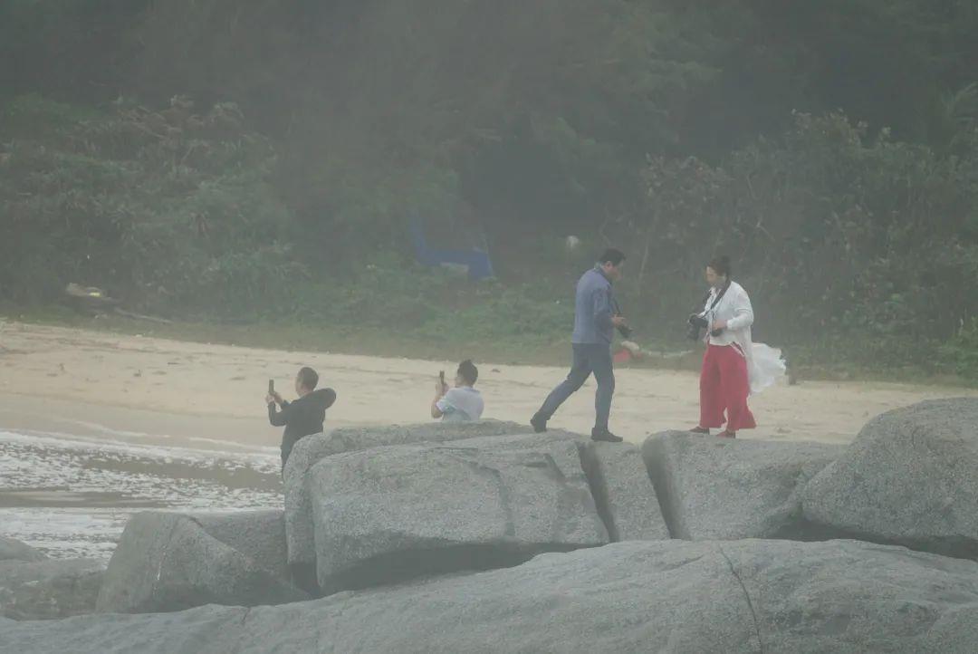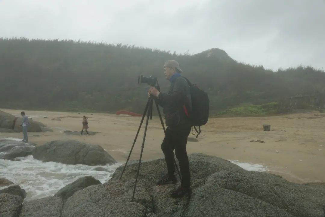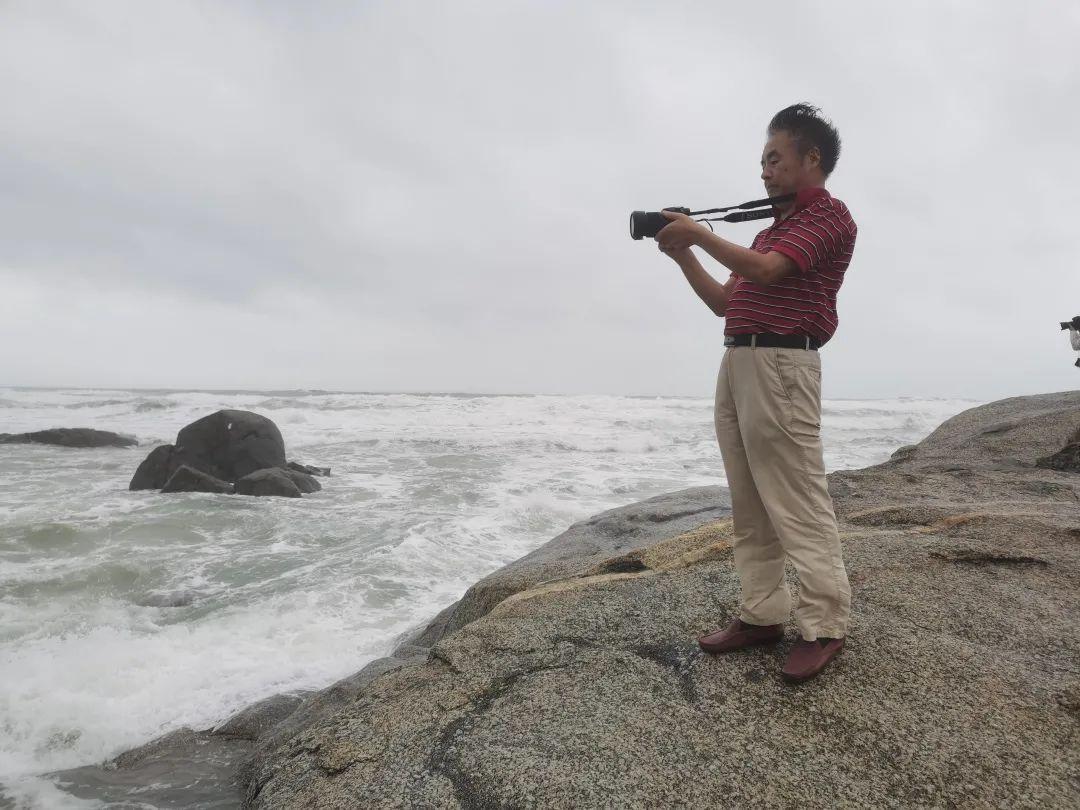 我也去了龙楼镇铜鼓佛光下的沙滩观察,这里怪石嶙峋,海景更加壮观,在“环高”台风作用下海面是惊涛骇浪,巨浪冲击岩石,掀起高高的浪花,我站在一块巨大的岩石上拍照、摄像,镜头不多会儿就被浪花溅起水珠打湿,使影像变得模糊,我不得反复擦拭,捕捉这并不多见的自然景观。与我有同样爱好的不少居住在附近的候鸟人,也来到沙滩、岩石上观赏、拍照、摄像。
