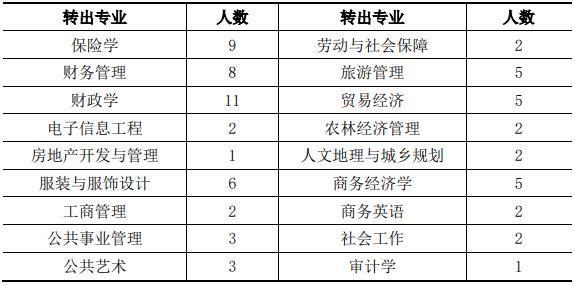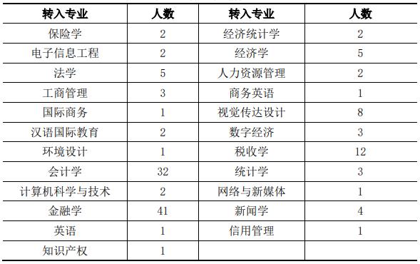 本学年,转专业学生135名,占全日制在校本科生数比例为0.58%。转出专业40个,转出人数较多的是金融工程和财政学专业;转入专业23个,转入专业人数较多的是会计学、金融学和税收学专业。