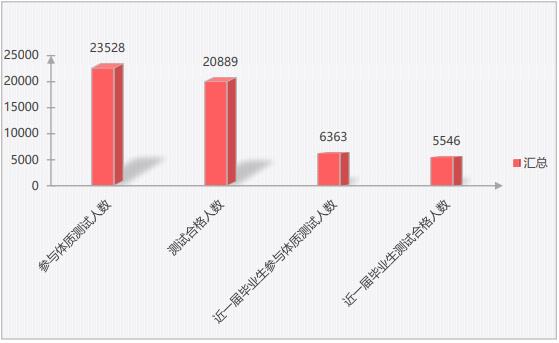 本学年内,参加国家体质健康标准测试的人数合计23528人,合格人数20889人,合格率为88.78%,其中近一届毕业生参加体质测试人数6363人,合格人数为5546人,合格率为87.16%。