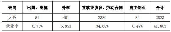 截至2022年8月,学校应届本科毕业生总体就业率达56.83%。毕业生最主要的毕业去向是企业。升学401人,占就业总人数的5.95%,其中出国(境)留学51人,占总体就业学生的0.75%。