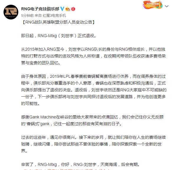 刚刚RNG电子竞技俱乐部官宣麻辣香锅RNG-Mlxg(刘世宇)正式退役,s8联赛后Letme、Zzitai都离开了,而麻辣香锅就再也没有出现在赛场上,就连RNG的夏季赛名单也没有出现过香锅的名字,5月底之后就一直有网友爆料香锅要退役了,这次是真的退役了时间定格在了2019年7月16日15:22。