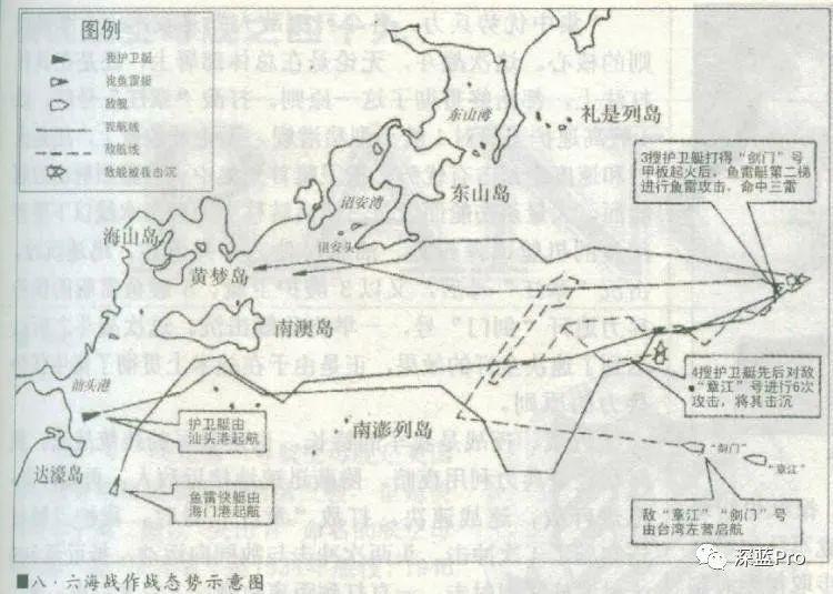 8 月5 日傍晚 17时45分,经向上级请示后,南海舰队派出护卫艇41大队的4艘62式护卫艇和鱼雷快艇11大队的6艘P4级鱼雷艇组成的突击群,前往南澳岛外海漂泊待机。8月6日零时,敌特遣支队按计划转向正北的东山岛方向,随后“剑门”舰水兵们协助7名特工登上橡皮艇,向东山岛方向驶去。此时“剑门”号在兄弟屿东南方约3.5海里的海域,“章江”号紧随其后,与其保持约半海里的距离。