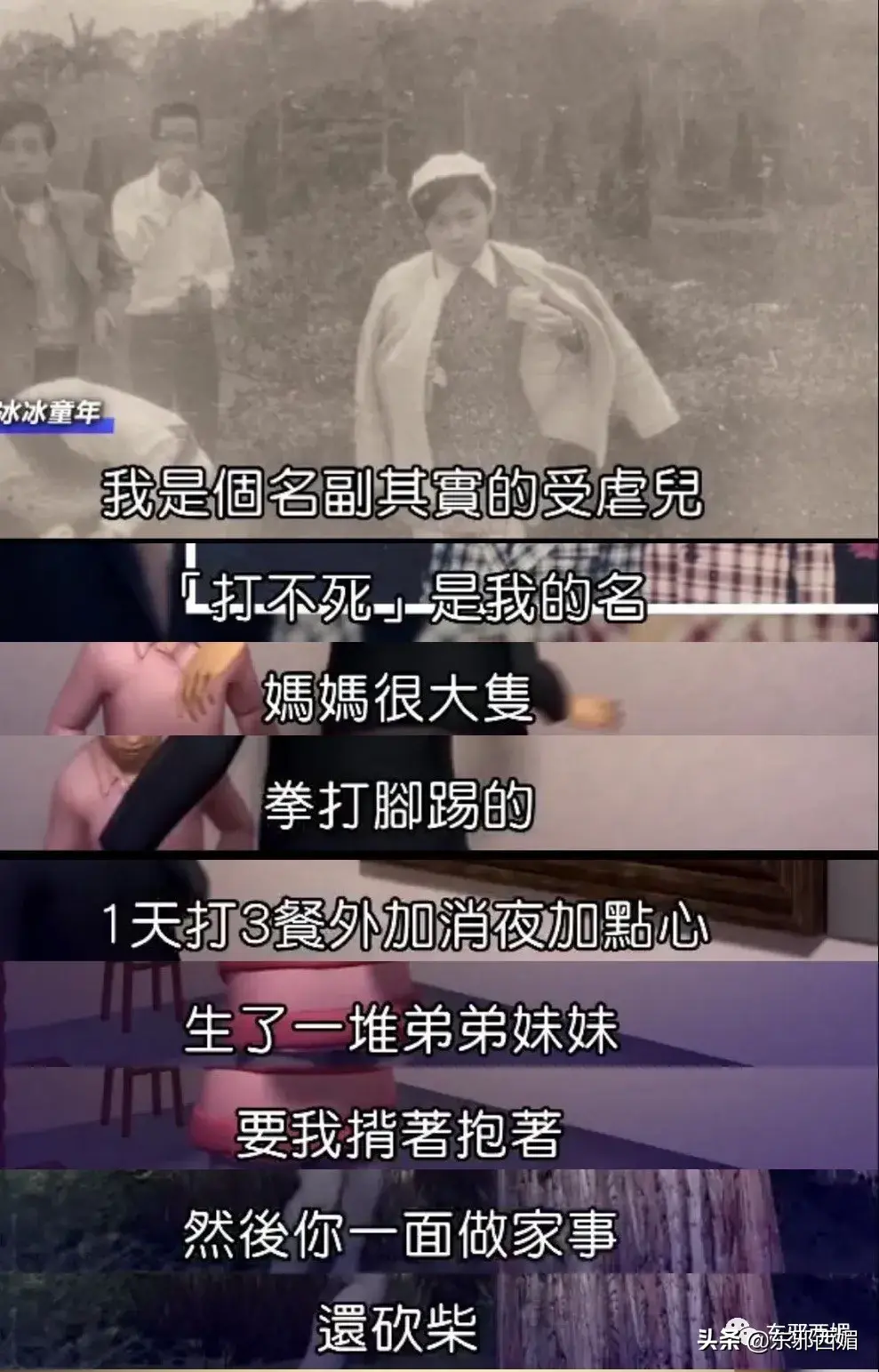 白冰冰的童年太苦了。她绰号“打不死”,因为妈妈人高马大,一日三餐对她拳打脚踢。所有弟弟妹妹都给她带,所以她早早要学着喂娃、砍柴和做女红。