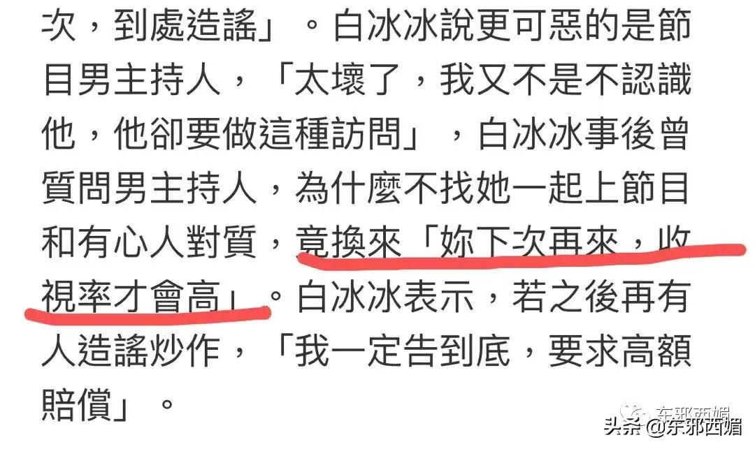 白冰冰去找节目主持人,质问他为什么不找自己一起上节目对质。可主持人却说:“你下次再来,收视率才会高嘛。”