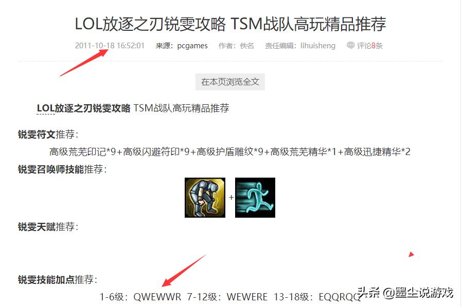 这张图是当年英雄联盟某知名论坛给出的高玩心得,主W副E的加点,半肉甚至是全肉的出装。锐雯在那个年代只是被大家当成一个吸收伤害,能打控制的承压型上单。