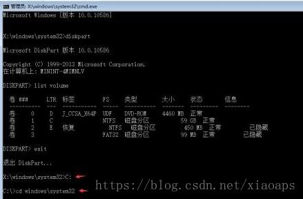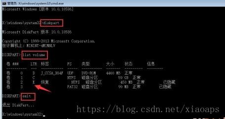 在管理员窗口输入diskpart 回车,再输入list volume 回车 输入exit退出diskpart工具,如图: