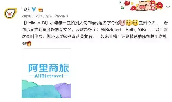 昨天连飞猪官方微博都忍不住吐槽:本来以为觉得自己英文名“Fliggy”很奇怪,但看到阿里商旅的AliBi,终于释怀了……