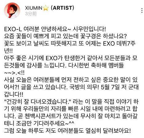 「EXO」「新闻」190409 XIUMIN亲自发布入伍消息,5月7日入伍服兵役