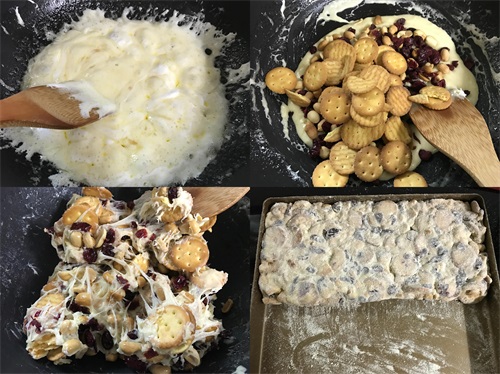 2、黄油放不粘锅中小火融化后放入棉花糖,开小火,用勺子不断搅拌让棉花糖充分融化,加入奶粉拌匀后倒入花生、蔓越莓干和小圆饼干,用勺子快速地将它们和融化的棉花糖拌匀。