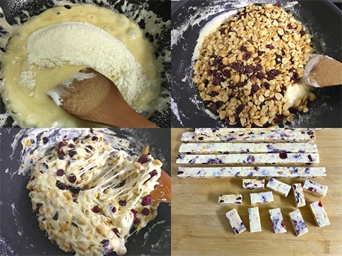 3、等棉花糖完全融化后加入奶粉快速翻拌拌匀,再加入花生和蔓越莓干一起快速拌匀。