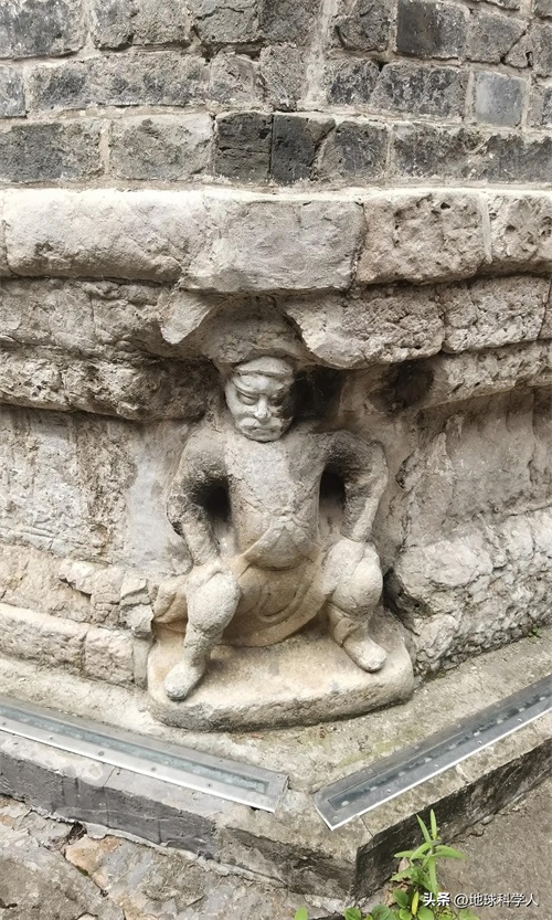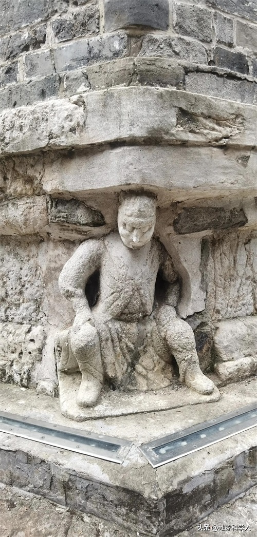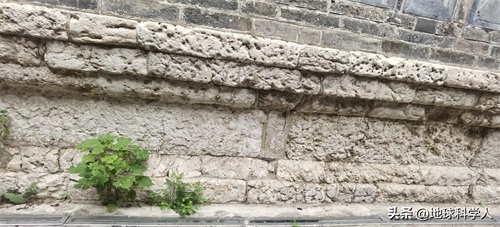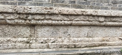 由于风化作用以及埋藏地下时碳酸盐岩的溶蚀作用,图案已经模糊不清。上部的三层岩石层厚度较小,由上往下收砌。