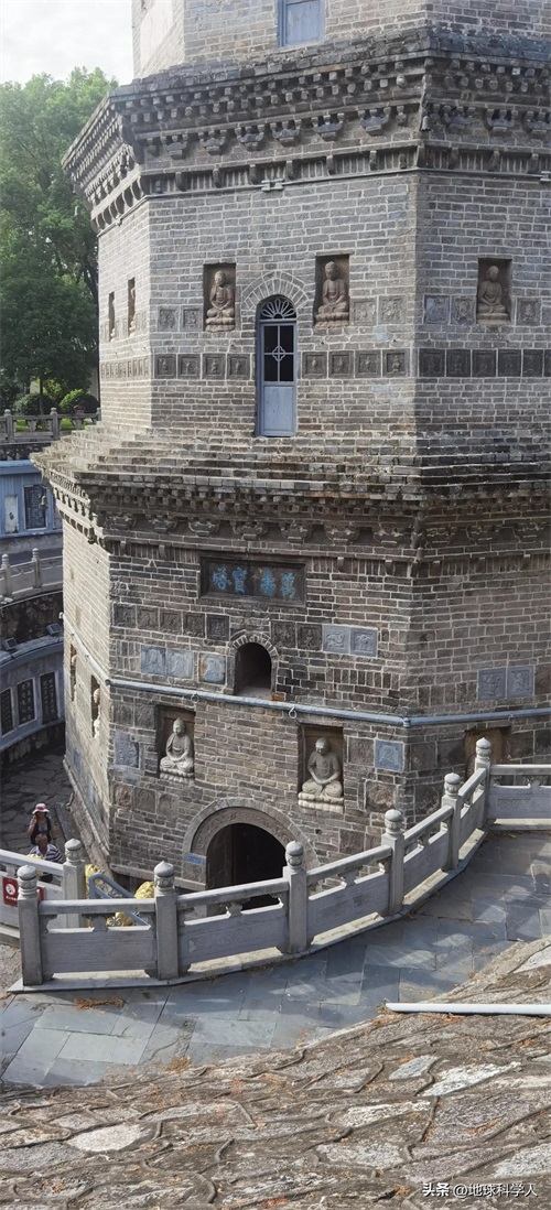 万寿宝塔所处地段沉积物主要为细砂、粉砂、黏土,其原始孔隙度高达30%~50%,具有较大的地基沉降。宝塔通高40.76米,相当于13层楼高,能让宝塔巍然屹立在河床中近500年不倒肯定基础筑得还比较扎实,但是沉降也比较显著,虽然我们无法看到地下的情况,但露出地面的塔座可以观察到。