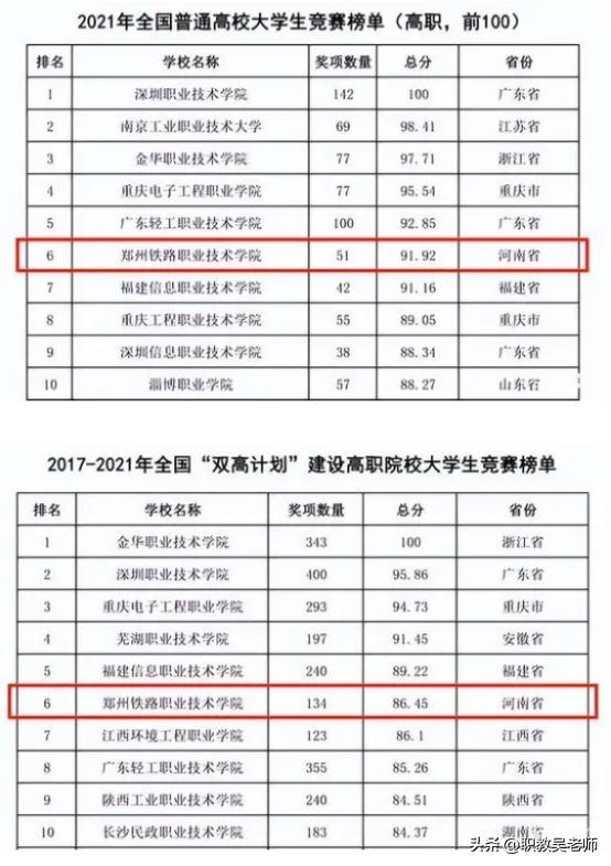 郑州铁路职业技术学院位居全国第6位、河南省第1位;,