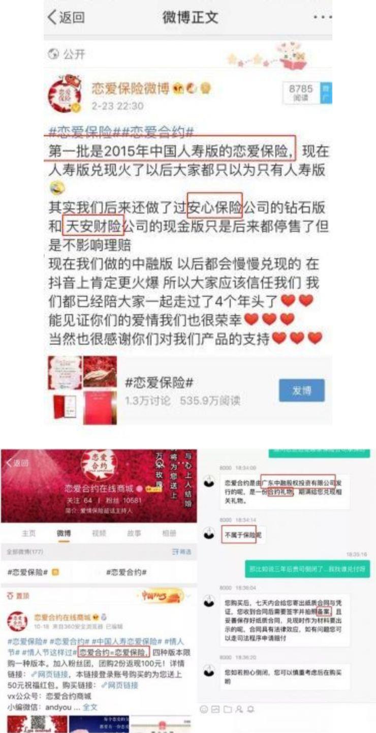 在微博上可以看到,名为“恋爱保险微博”、“恋爱合约官方”的账号发布了几乎同样的“恋爱保险”产品,并称此前与多家大型保险公司合作推出过多种版本恋爱险,引导网友们进行购买。