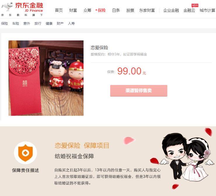 通过调查,中国人寿、京东金融等保险机构都曾出品过这类“恋爱保险”。